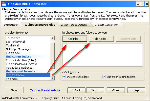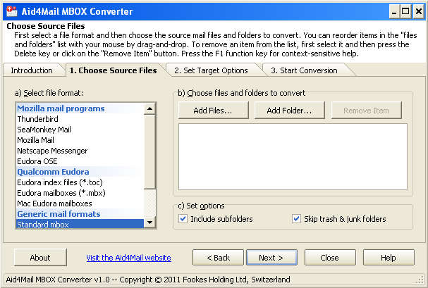 To start the conversion process, all that you need to do would be click on the Choose Source File tab, which can be seen on the image above. On the left select the type of programs that you want to convert from, if you’re converting a standard Outlook mailbox, select Standard mbox under the Generic mail formats section and then in the window on the right, select either Add Files, if you want to convert individual inbox files, or select Add Folder if for example you would like to select all the files from a certain directory, including the sub-directories.