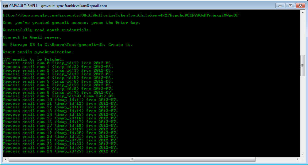 When the authentication is completed, Gmvault is gonna automatically start backing up your emails.