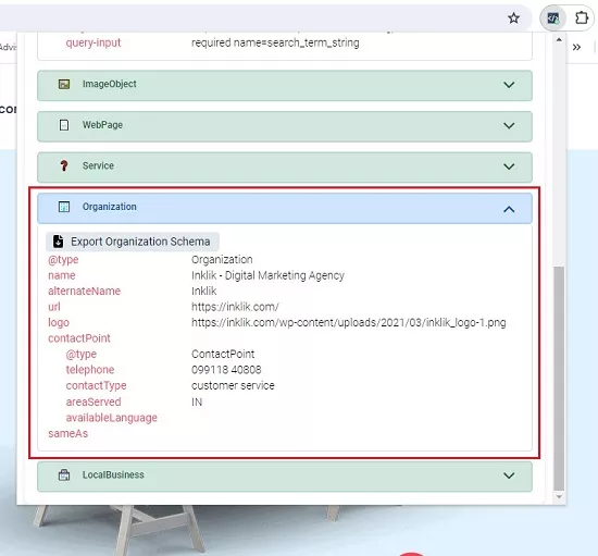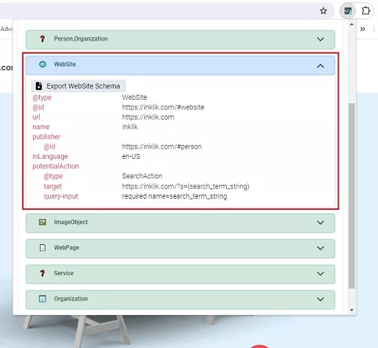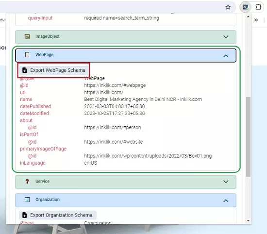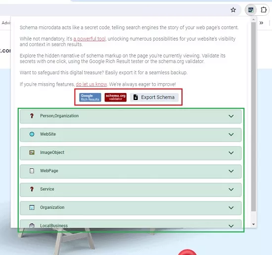 The plugin allows you to view all the Schema Types such as Person, Organization, Website, Webpage, Service and more on a single page. Additionally, you can export the schema markup of the entire page or each individual type in JSON format for further study and evaluation.