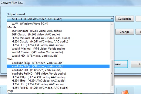 After adding multiple files, you can hit the Convert button and a new window will open up. Using this window, you can select output format according to your choice. For example, if you want to convert videos that are supported on web, then you can find the suitable output format, like it is visible in below screenshot. It is helpful if you want to upload videos on web.