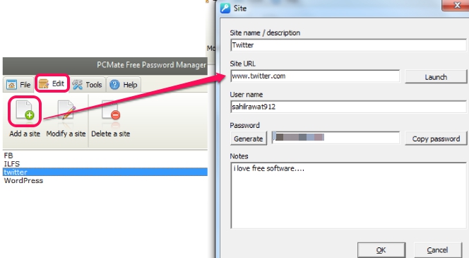 PCMate Free Password Manager- edit option to add a site