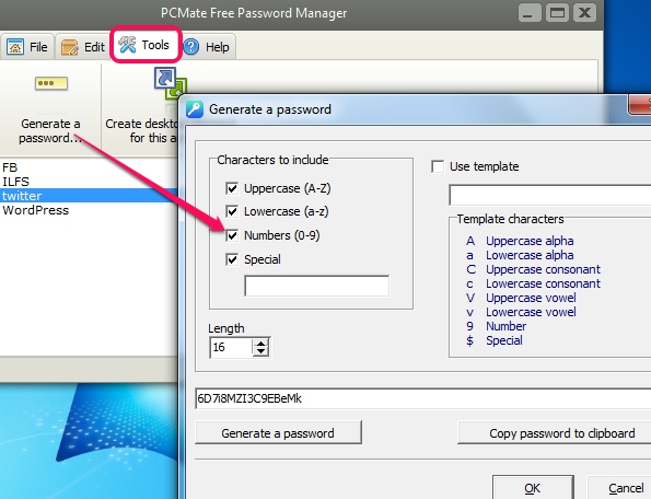 PCMate Free Password Manager- tools option
