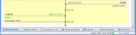 Money on thread is a basic free personal finance software and in a thread in its main interface it basically sorts the income and expenses, with the newest items at the bottom. The left side lists the income, the right the lists the expenses and the middle bar indicates the money that is currently available with you. You can also see the available money in the main interface when you start the program. Money on Thread makes use of graphs, lists and reports that can be opened from the footer bar of the application.