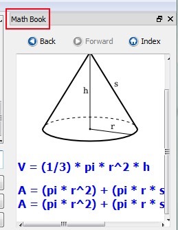 - Available Math Book gives 3D and 2D objects such as cube, sphere, circle, cone, and more (with formulas). See the below screenshot: