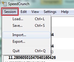 - Session Option: This is quite useful option that helps to save your current session (in form of *.sch) and lets you load saved session again. Moreover, you can also export all your work in form of text file or HTML file and can import that work again in SpeedCrunch.