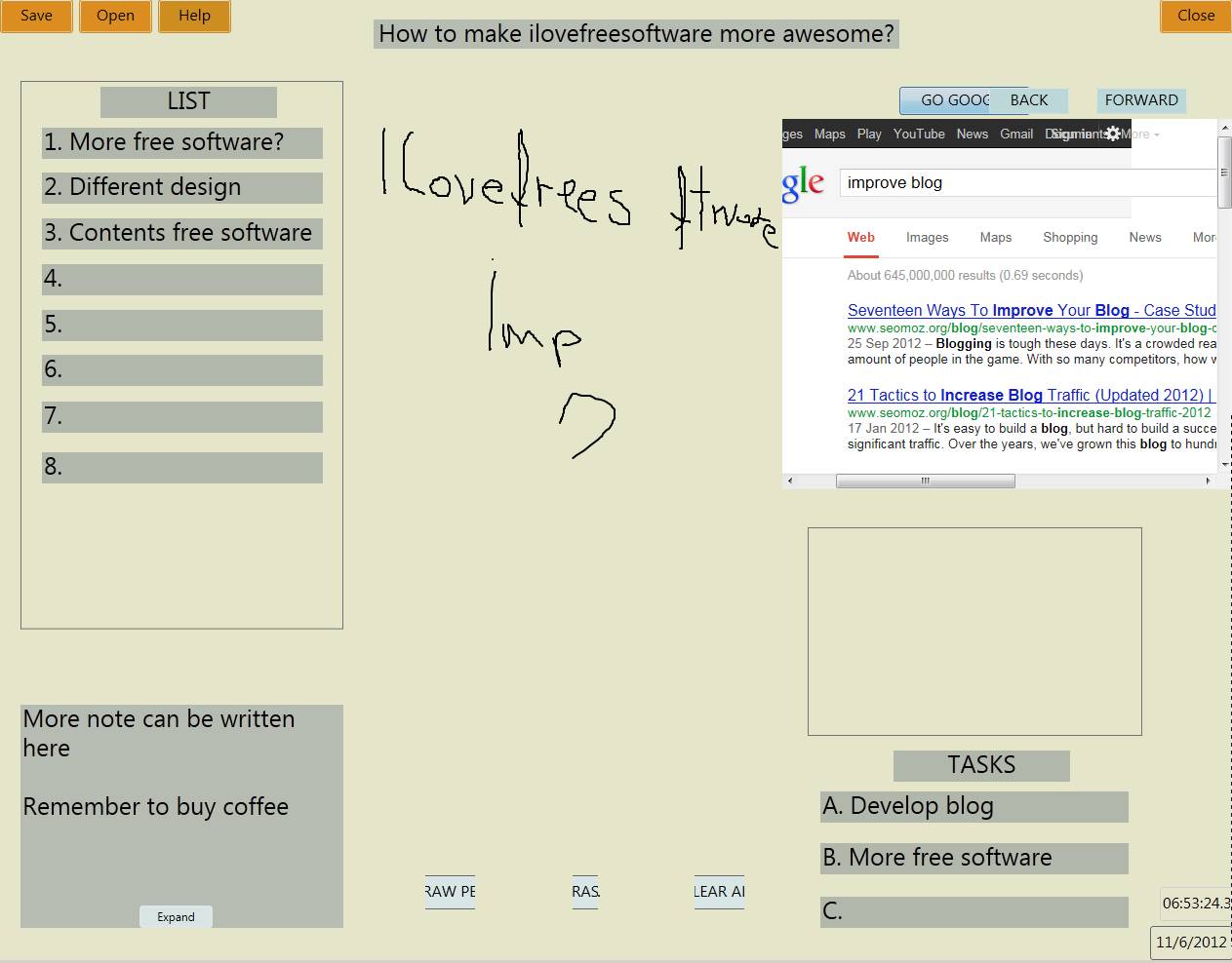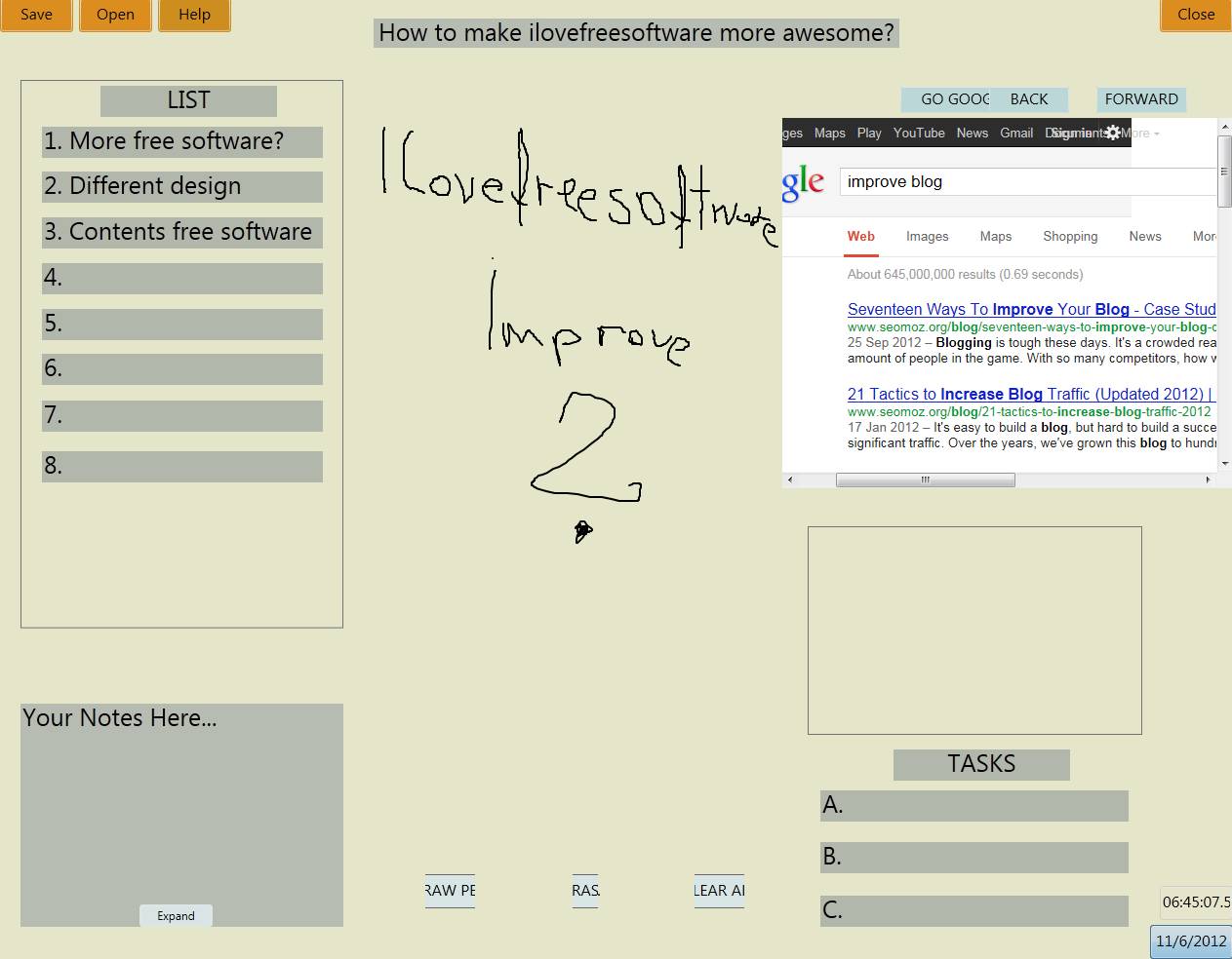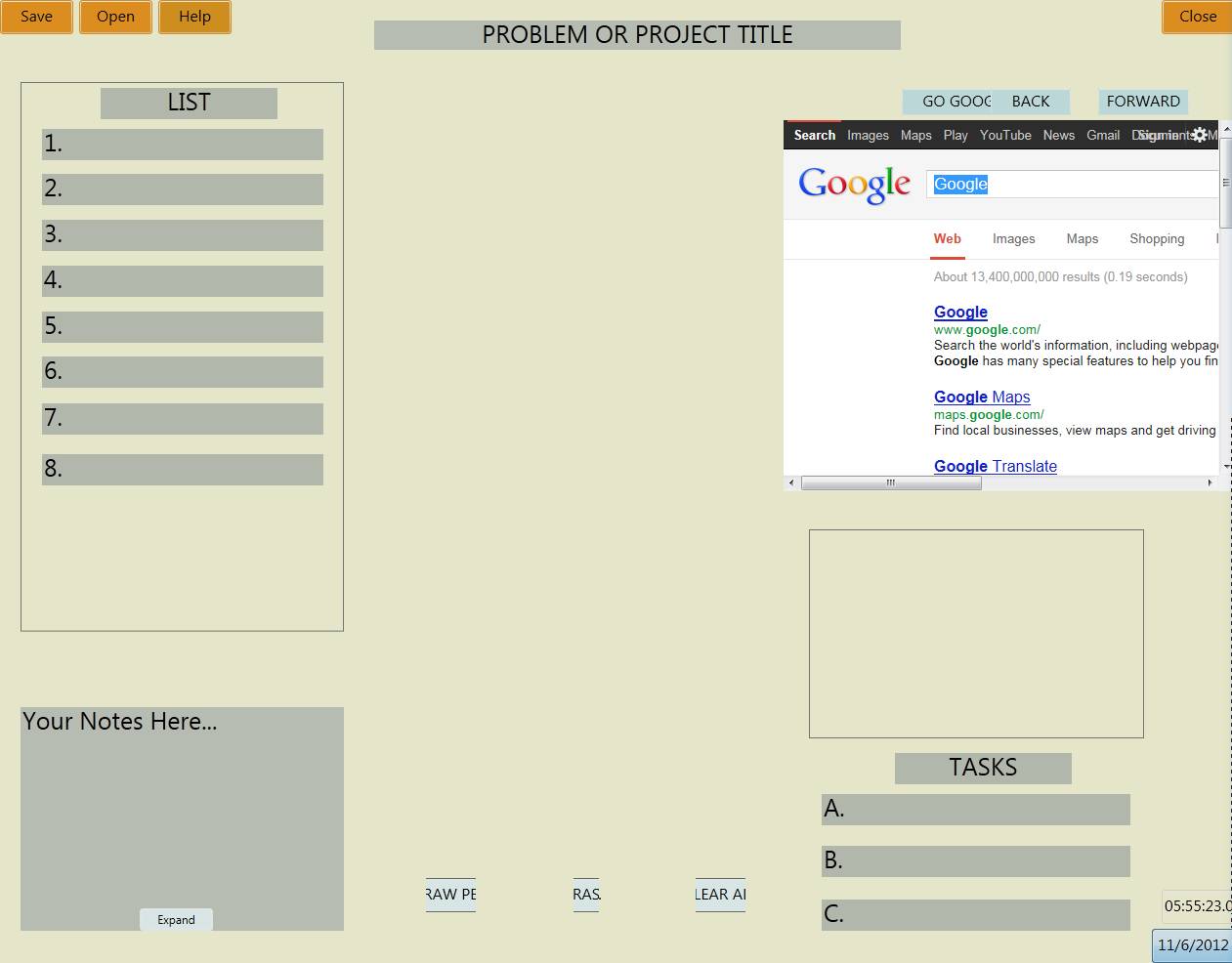 As you can see from the screenshot above, iWorkBoard is a very feature rich virtual work board for Windows. Left side of the interface is where you can see a List which is intended for breaking down to steps of the business idea, work project or anything else that you might have thought of. Below that you can find a Notes area where you can write down any additional information that comes to your mind. The entire middle area is where you can draw freely using the Pen tool. Right side is where you can find a Google search window and below that a Task list where important duties of yours can be written down. You may also check out NoticeBoardPro reviewed by us.
