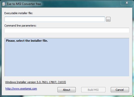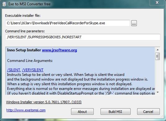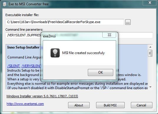 Once you choose the file, you can add command line parameters for it (Exe to Msi Converter Free automatically detect these parameters for most of the EXE installation files). When you are done, you can press “Build MSI” button at the bottom to create an MSI corresponding to the selected EXE file.