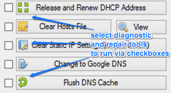 Pretty feature loaded, don’t you think? As illustrated by the above screenshot, the above window is all that you get for NetAdapter’s user interface, but it’s quite full of options nevertheless. Roughly, the user interface can be considered as divided into two vertical panes. The left pane consists of a whole lot of button based troubleshooting and repair sub-options. Each of these accomplish a single distinct task and have a checkmark before them. You can either run these diagnostic/repair options individually, or select them via checkboxes to run multiple of these at the same time. There’s also an Advanced Repair option, which requires a system restart. Here’s a brief listing of what these options let you do: