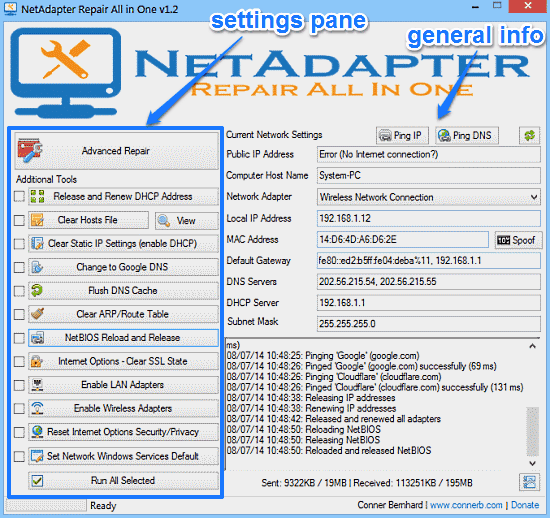 NetAdapter (or NetAdapter Repair All In One) is a really useful free software to troubleshoot and repair Windows network problems. As its name suggests, NetAdapter is an all in one tool that can troubleshoot your computer’s network adapter(s) for any and all kinds of network problems, and can fix them up as well. It’s an easy to use yet comprehensive software that consists of a number of network diagnostic and repair sub-options. You can use NetAdapter to manage IP and DHCP address settings, flush DNS cache, Enable/Disable wired and wireless network adapters, and much more. Apart from that, you can use the IP and DNS ping options, and view general network settings such as IP and MAC addresses, subnet masks and things like that. And for all of this goodness, you don’t even need an installation, as NetAdapter is available as a standalone portable application. Sounds interesting? Keep reading to find out more.