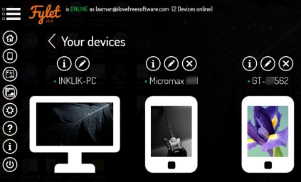 • Photos can be transferred from multiple android devices. The only thing you have to do is install Fylet android app and login with the same login credentials. After this, on its PC interface, you will be able to see all the connected devices. See the screenshot below: