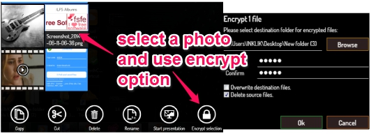 • You can even encrypt transferred photos which protects photos from unauthorized people. To encrypt a photo, just select it, and use Encrypt option. After this, you need to provide a password to encrypt the photo. To get back original photo, just select the photo, and use Decrypt option.