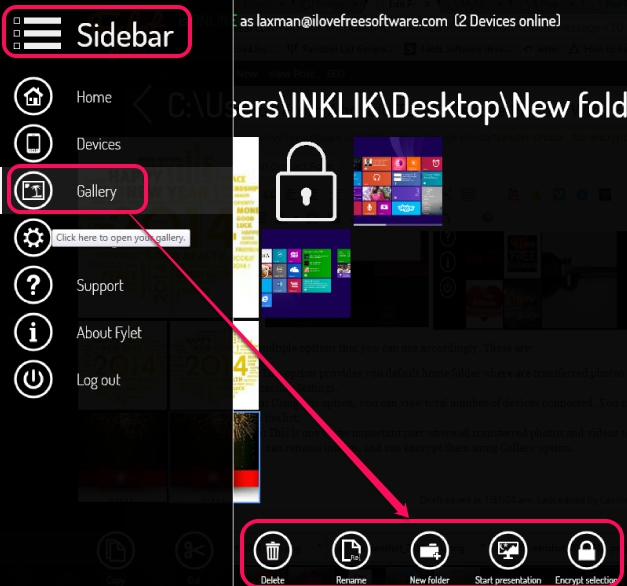 • Gallery option: This is one of the important part where all transferred photos and videos will be available. You can start image slideshow, can rename images, and can encrypt them using Gallery option.