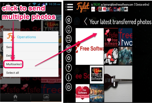 Fylet is a handy application that is used to transfer photos from android to PC automatically or manually. Not only just photos, it is able to transfer video files as well. The major advantage of Fylet is that you can transfer photos from anywhere and you don’t need to connect with the same network. To transfer photos, you need to install this application on PC, on your android device, and log in to Fylet by creating a free account. After this, it will establish a connection between devices (that are logged in with same login credentials) and you will be able to send photos. There is no cloud based connection and therefore privacy remains only with your devices.
