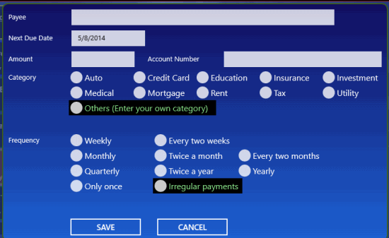 - Provides different options to add a bill, like: Payee, Next due date, Amount, Account Number, Category.