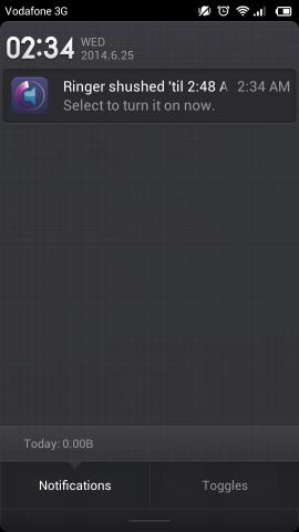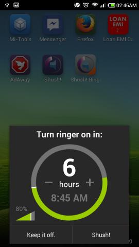 Once done, just press on the ‘Shush!’ Button and if you don’t want to use the timer, then use the ‘keep it off’ button. After this, the app will display till when the ringer will be restored in the notification panel as seen here.