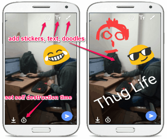 You can now simply tap on any of the masks which you want to add to your photo or video flash. Once you select a mask, it will be applied to your face on the camera. To get a better result, you can move the phone or your face to perfectly place the mask on your face before capturing a photo or recording video. After applying a mask, you can simply tap on the icon of the selected mask to capture a photo or tap and hold to record a video. When you’re done capturing a photo or recording a video with the mask, it will allow you to add doodles, text, stickers, and also set the self-destruction time of the photo or video flash.