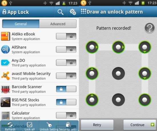 App Lock is a free Android app to lock apps on Android. This app provides a pattern lock and a password lock to lock the installed apps on Android. To set the pattern lock, just launch “App Lock” app. Now, you will see the list of all installed apps. Select the app which you want to lock and enable the lock button on the selected app. You will see the pattern lock or password lock activated on the selected apps. Before accessing locked apps, you need to draw the pattern or enter the password to unlock it.