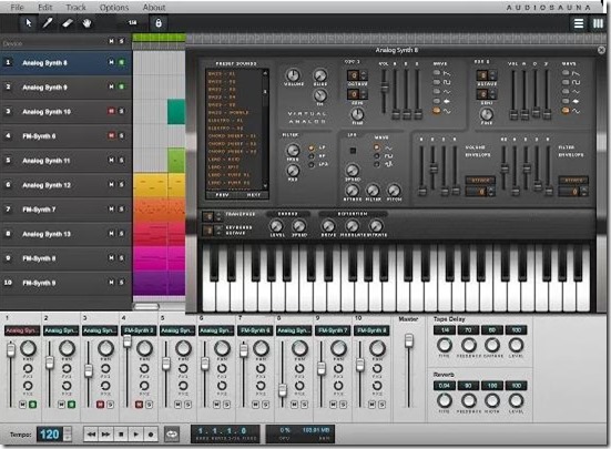AudioSauna is a free Chrome app that provides you online audio workstation that lets you make music online, just like professionals. Using this Chrome app you can now create music online right from your browser. This music creator Chrome app is a feature rich audio workstation where you can create melodies and provides you the facility to record them as well. It offers you music creating tools which include two synthesizers (FM Synthesizer and Analog Synthesizer) and a stereo sampler. FM Synthesizer comprises of 4 sine wave operators and some preset sounds like beast, funky, e-piano, vibraphone, etc. Analog Synthesizer comprises of 2 analog oscillators along with 5 waveforms such as SINE, SAW, SQUARE, NOISE, and TRIANGLE. Both the synthesizers have volume and filter envelope, and some built-in effects like bitrate, distortion, and chorus, which you can use intelligently in order to create music online. Stereo sampler provides you normal and ping-pong looping support using which you can create music in the desired direction. This Chrome app offers you various tools like Pencil tool, Eraser Tool, Note edit tool, and more, using these you can create notes, erase them or opt to edit the velocity of note(s) or the cutoff of note. You can either import a music file from your computer and edit the music and save it to your desired folder, or else you can create your own music and save it to you computer. This is an apt Chrome app that lets you make music online and compose like professionals.