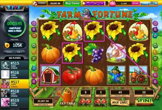 Once you choose a game and click on it, it will open up in your window and look like the screenshot given above. The top of the game screen will show you the number of chips you have which you can use to bet in the game and the current level you are at. Below this you will be shown the current top players in the game. On your game screen you have to get some combinations to win, so go ahead and click the green spin button at the bottom to start spinning. The amount of money you win will be displayed in the bottom center of the screen. Left side bottom shows the amount that you are betting in this spin. You can increase or decrease this amount. You can also set the game to auto spin, so you don’t have to spin it again and again.
