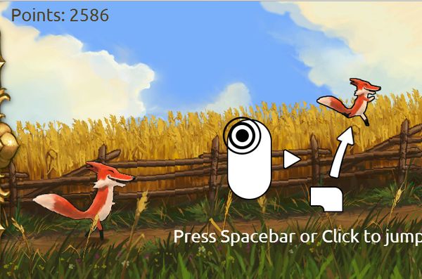 You jump either by clicking on spacebar or left clicking. The longer you manage to run, the more points you’ll get, but the longer you run, the faster the fox starts to run and game starts becoming more difficult.