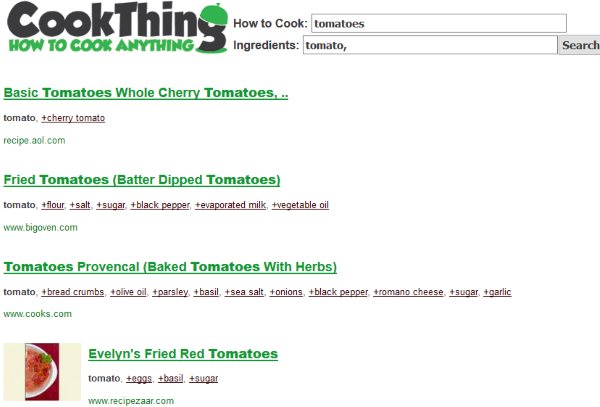 CookThing is a nice search engine dedicated to food. When you open up this website you will see an interface like the one seen in the screenshot above. There is a search box in the center which says how to cook. In the search box you can add the name of a ingredient, or you can add a name of a dish. Then click on the cook it button. In case you have chosen a ingredient, then you will be shown a list of things that could also be included in the recipe. You can choose other ingredients from the list and proceed. Now you will be shown a list of recipes which match the ingredients that you have selected. This can be seen in the screenshot below.