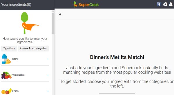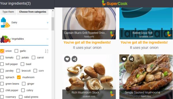 SuperCook is another nice search engine for food. On this website you will see a page like the one shown in the above screenshot when you land on its homepage. On this page you have list of ingredients divided category wise. So for the recipe you are looking for, you can either choose ingredients from the left side box or you also have the option to mention the name of the recipe that you are looking for.