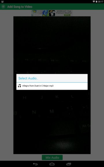 Add Audio to Video by Techno Craft works pretty much the same way that the previously mentioned Add Audio to Video by Android Pixels does, only it has a more polished up interface. For example it doesn’t show selection menus for video and audio, but rather detects them and displays all the available media in its own galleries.