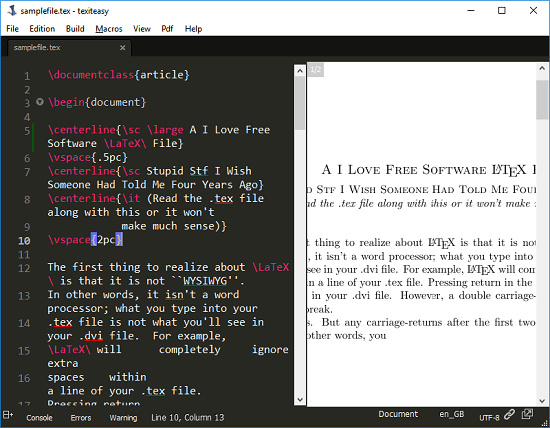 TextitEasy is another free software to edit LaTeX files easily in Windows. This is good LaTex editor, but comes with fewer features than the software above. You can easily edit any TeX file in it and then save the changes in that. It offers a dual pane interface to show you the TeX code on one side and the view of the document on the other. And the best part is that it offers some pre built macros that users generally use. Which is really time-saving while you are editing a long file. It offers a clean interface where you can edit the LaTex file and see the preview of the final document. And after editing the file, you can export the LaTex to a PDF file or do what you want.