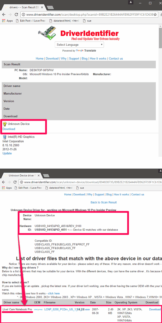 If your PC is connected to the internet, then it will open your browser and will load its website where it will show you the scan result of your PC. In the result, there is a section Unknown device, which has the details about the unknown device. And when you click on the download link which is given in front of “Unknown device”, it will show you the name of the device, its hardware id and link to the corresponding drivers if there is any. After that, you can download the drives for your device if you want to. You can see the above screenshot.