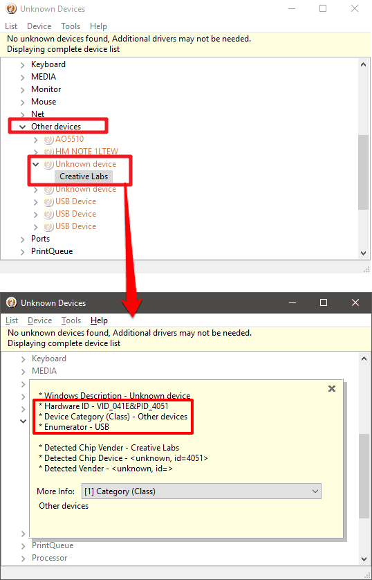 You don’t really have to install the software in order to make it work. Just grab its executable using the above URL and then launch it. After running the application, it will start searching the devices on your PC. And when the scan completes, it will list all the devices on its interface according to their type. And the unknown devices are listed under the Other devices section. Expand the Other devices section and click on the unknown device, and it will show the vendor name of the device. When you double-click on the device entry, it will show you more details like hardware ID, enumerator, etc. You can search the hardware id directly on the internet to get to know the device name, drivers, etc.