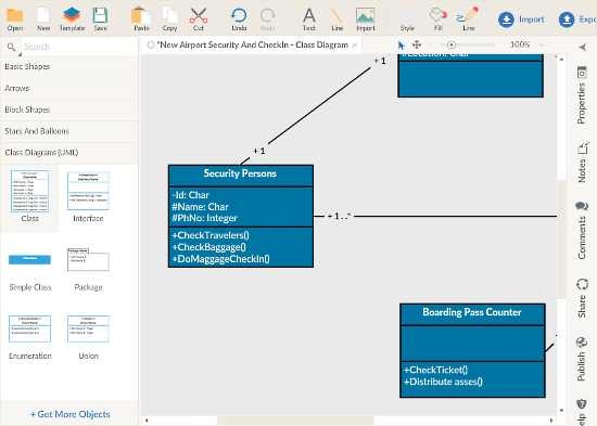 With RealTimeBoard, you can easily draw class diagram online. Along with all the essential tools for drawing diagrams, it offers other additional tools, such as a pen, sticky notes, comments, etc. It also lets you import image, SVG, diagram files which you can use in your design. After drawing your class diagram, you can export it as PNG, SVG, PDF file. You can export your diagram to a CSV spreadsheet as well.