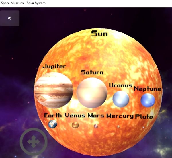The entire solar system model is shown to you in 3D with sun at the center and planets rotating around it. The background narration will give you more info about the solar system, so listen carefully. You can explore each of the planets individually also and get to know more about them. You can also see the comparison in size of all the planets, which can also be seen in the screenshot below.