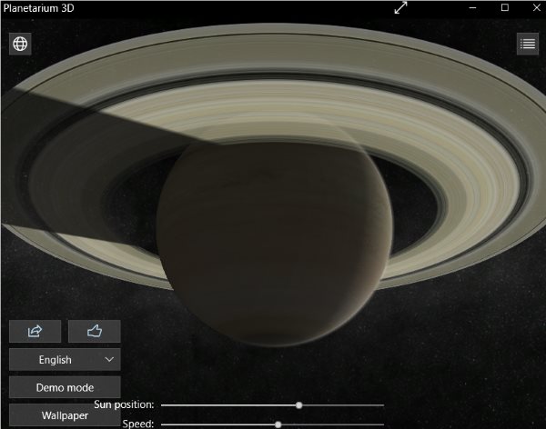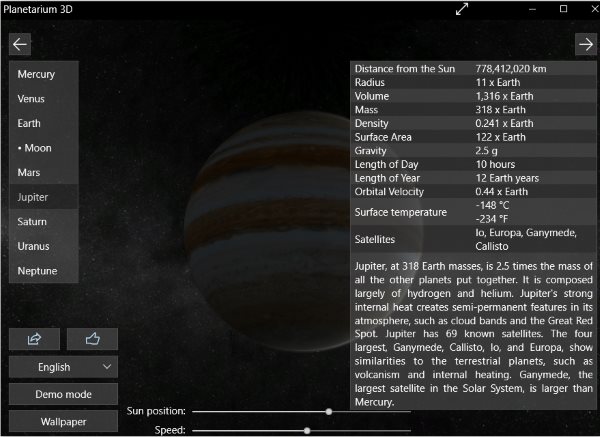 All the 8 planets and the moon are listed on the left side menu. Clicking on any of them will bring up their 3D view on the app screen. The right side menu gives you detailed information about the planet that you selected. You can see how far it is from sun, its radius, mass, volume, density, surface area, length of day, length of year, etc. There are options at the center bottom of the screen to change sun’s position and the speed of rotation. There are sliders given for each of these. You can play around with those. Also you can click the wallpaper button to take a screenshot which can be used as your desktop wallpaper. The demo mode will take everything away from the screen and you can have a clear 3D view of the planet in motion around its orbit. You can even change the language of the app if you want to.