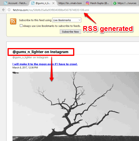 Step 2: Now you will be able to preview the RSS generated by this service for that particular user. You can view post description, title, and photo.