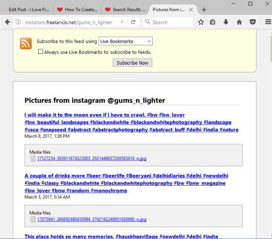 So these are some very good services to create RSS for any Instagram user. These are handy when you want to remain updated with latest posts of a particular Instagram user, but don’t want to use Instagram specially to see what he/she has posted. Just create the RSS URL and add it to your favorite RSS reader. My favorite in this list is definitely “Instatom”.