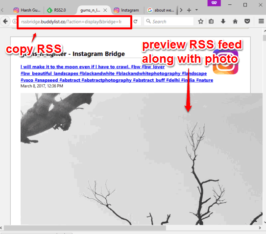 Free RSS Bridge supports dozens of services to generate RSS feed. Among those services, it supports Instagram also, known as Instagram Bridge. This service also doesn’t require any sign up.