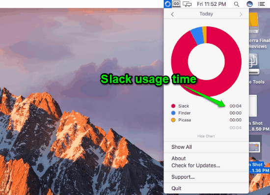 Here, we will talk about how to find time spent on the Mac client of Slack. This can be done using a free Mac app called “Usage“. This app simply sits on the menubar, monitors your program’s usage, and logs the work time automatically. It comes with a useful feature which lets you see your work time on Slack by sorting them by a day, week, and month. It also shows a pie chart for all the apps which you use and the time duration with color codes.