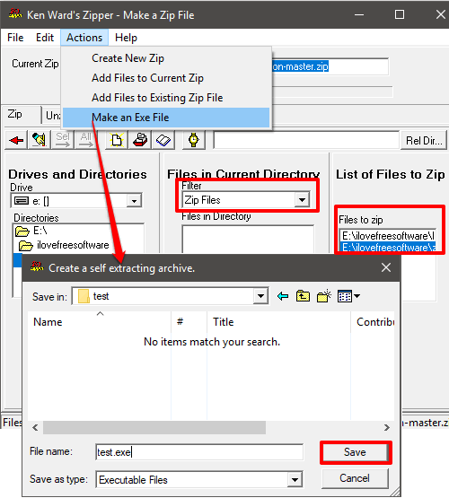 And when done, it will only list the ZIP files. To add the ZIP files in the conversion list, double-click on it and then choose “Make an EXE file” option from the Action menu. After that, it will ask you for the location and file name to export the final EXE file. Finally, hit the Save button and the ZIP files will be converted to the self extracting EXE file and exported to the directory that you have specified.