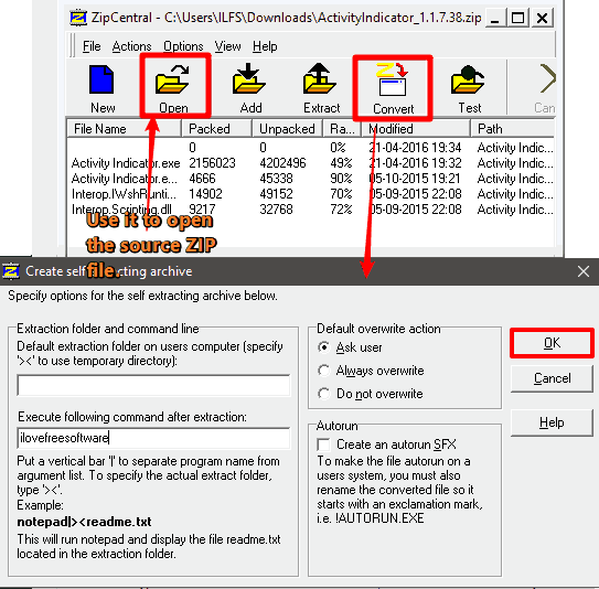 It’s fairly simple to use ZipCentral to convert a ZIP file to EXE file. Just grab its setup file from the above link and then install it on your PC. After that, open it up and then you will see its interface. Use the open button to import the ZIP file that you want to convert to EXE file using it. After that, hit the convert button and a pop-up will appear, asking you to specify certain option such as default extraction folder, create auto run, or specify the overwrite actions. After specifying these, click on the OK button to start the conversion process. If all goes well, them you’ll end up having an EXE file in the same directory where your ZIP file is.