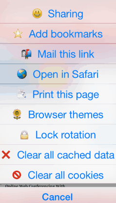 You can add bookmarks from here, email any website link, print a page, change browser themes, clear cache data, clear cookies, etc. The bookmarks you add can be accessed from the bookmarks icon present on the left hand side of the address bar on top of the page. You can also add your bookmarks to the cloud and access them from anywhere and any device using saved.io.