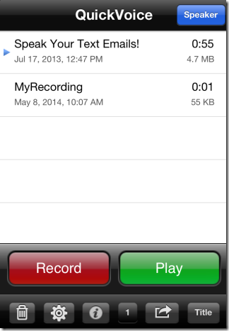 QuickVoice® Recorder is the second last app in the list. This is basically a voice recorder app for iPhone. You can use it to record any voice but if you want to set any of the recorded voice as reminder, then tap on Share option and select Set as Reminder. Now, choose the date and time of your choice and you are done. You can even send any of the recorded voice to anyone via email but there is a limitation of 5 MB on the file size. It means you can send recording up to 5MB in length.