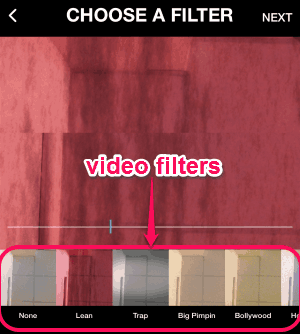 When you’re done with adding beats and recording videos, it lets you apply tons of video filters to make your mini music videos look astonishing and great. The available video filters are Lean, Trap, Big Pimpin, Bollywood, Hollywood, and much more. The following screenshot shows how to apply video filters.