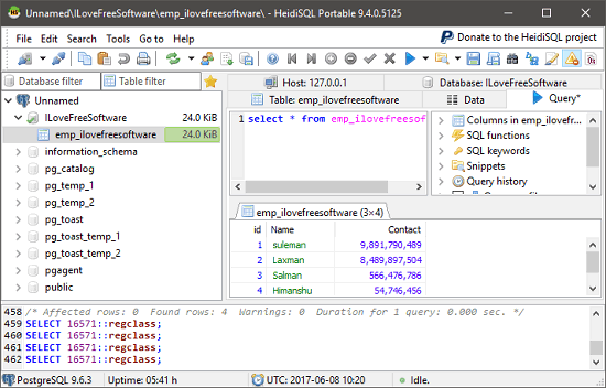 It’s pretty easy to use HeidiSQL to edit PostgreSQL databases. The software also comes as portable software so you can also use HeidiSQL without installing it on your PC. When you run the software, it will ask you to enter the connection parameters. After providing correct parameters, you will see the database components on its interface. You can open the tables and then start editing them either by running SQL queries or edit them manually. Whatever operation you do, the software generates the corresponding SQL statement and shows it in the bottom pane.