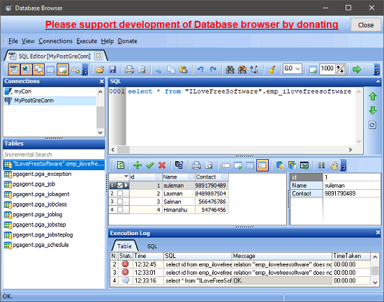 Database Browser is another very good PostgreSQL editor for Windows that you can use. The software is not only meant to connect to a PostgreSQL database, but you can also connect to other database types. Database Browser freeware lets you connect to SQLite, MySQL, like databases as well. It comes with a good GUI and you can easily connect to local or remote PostgreSQL database.