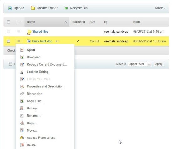 You can perform many actions like open the file, download the file, replace the current document, lock it for editing, edit in MS Office, view the properties of file, view the discussions on it, copy the link, rename it, copy it, move it, restrict its access permissions, or delete it. You can directly select all files and delete them using the Recycle Bin button.