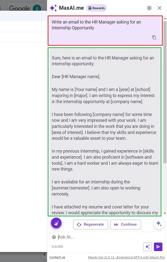 5. Input the description of the email that you wish to generate in the text box at bottom of the sidebar, and press Enter. For example – ‘Write an email to the HR Manager asking for an Internship Opportunity’ or ‘Write an email to your superior asking for a raise’ etc.