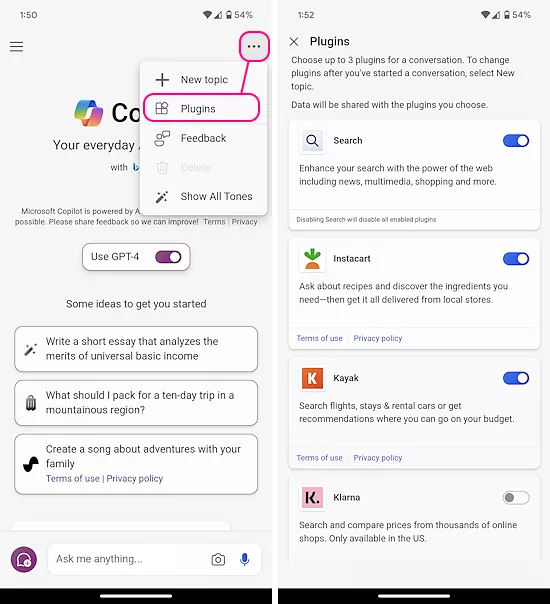 To use the Copilot plugins, first, you have to install the Microsoft Copilot app. The app is available for Android as well as iOS. You can install the app from the respective app store. The app does not require any login. It directly loads the Copilot chat interface with a toggle to enable/disable GPT-4. From the 3-dot menu of the app, you can access the plugins.