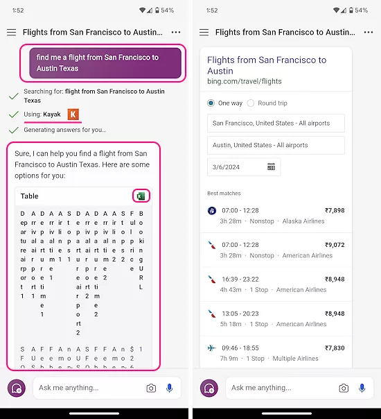 After enabling the desired plugin, you can simply ask Copilot a question and it uses the plugin to fetch the respective results. For example, I enabled the Kayak plugin and asked you for a cheap flight. The app reverted with an Excel sheet listing the 5 cheapest available flights for the mentioned trip. Thanks to the Kayak plugin, it provides detailed information on each flight with departure, arrival, stops, prices, and more. Copilot also provides an interactive Bing Travel interface that you can use to search for flights. This way, you can use any of the available plugins to get better results with Microsoft Copilot.