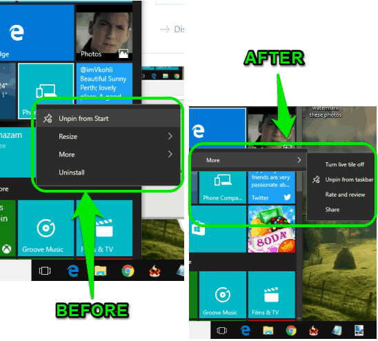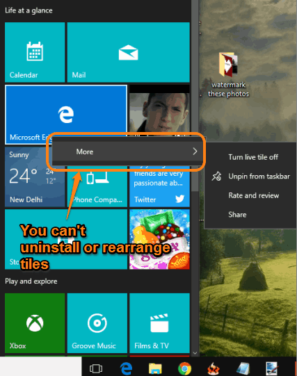 Step 3: Now open Start menu and try to drag any tile. You will notice that you can’t do this anymore. Moreover, right-clicking on a tile will also not show options to resize, uninstall, and unpin the tile. Only More option will visible.