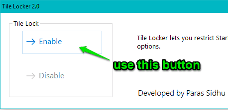 Step 2: Its interface is very simple and has only two buttons. Use Enable button to lock Start menu tiles. You need to restart PC, sign out and sign in again, or restart File Explorer to apply the changes.